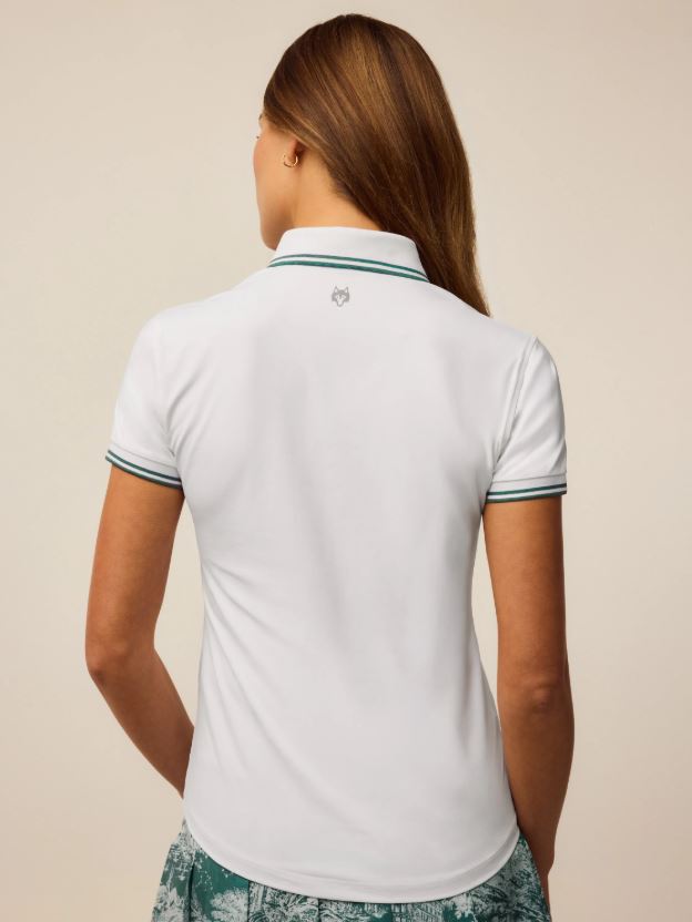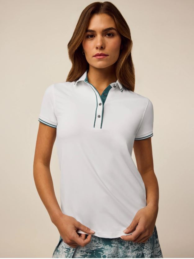 The Scarlett Luxe Short Sleeve Polo is a women’s performance polo crafted from smooth, stretch fabric that combines performance with a polished look. Designed with an athletic fit, it offers comfort and ease of movement on and off the course. Featuring a classic spread collar and a refined four-button placket, it is elevated by striped knit detailing on the placket and sleeve cuffs. This short sleeve polo balances sporty functionality with modern styling. An essential that combines performance and luxury.