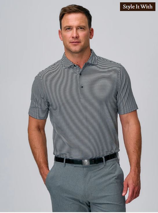 A striped polo that’s equally at home on the course or Park Avenue. It features a clean, slightly tapered silhouette, and a customizable memory collar that lets you create the perfect shape with every wear. Ultra-lightweight, moisture-wicking, and UPF 50+ stretch fabric keeps you covered and comfortable from the first hole to the last.