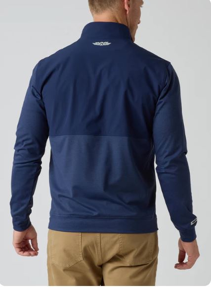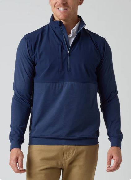 The Harding Hybrid Quarter Zip is a midweight pullover featuring brushed jersey sleeves and back, with a woven upper body detail that offers extra protection from mist and wind on the course.